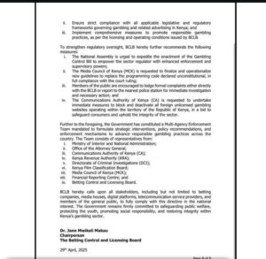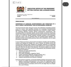 “In view of these occurrences and pursuant to the statutory mandate under the Betting, Lottery and Gambling Act (Chapter 131,Laws of Kenya), the Betting Control and Licensing Board hereby orders the immediate suspension of all gambling advertisements and testimonials across all media platforms for a period of 30 days with effect from the date of this statement ,” the letter read in part.