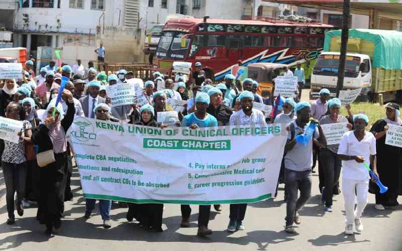 Kenya Union of Clinical Officers coast region at a peaceful procession towards Mombasa Governor’s office in Mombasa in 2024 strike.Photo courtesy
