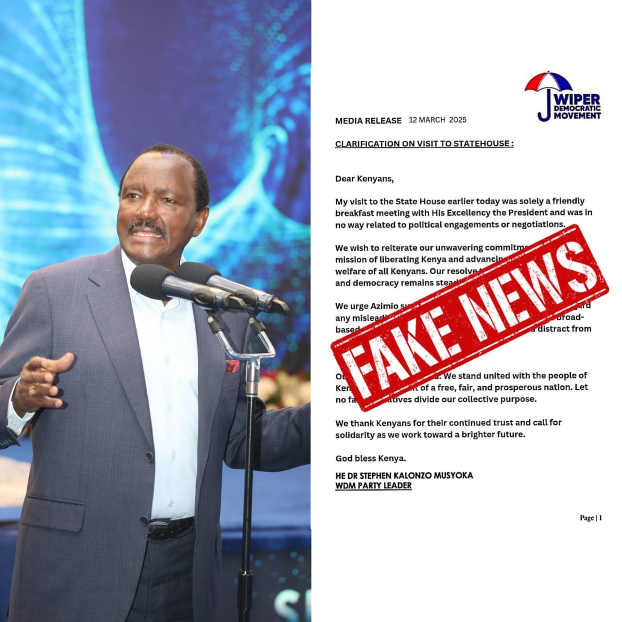 Wiper party leader Kalonzo Musyoka has dismissed claims a circular going around social media of a clarifying his visit to State House on Wednesday, March 12.