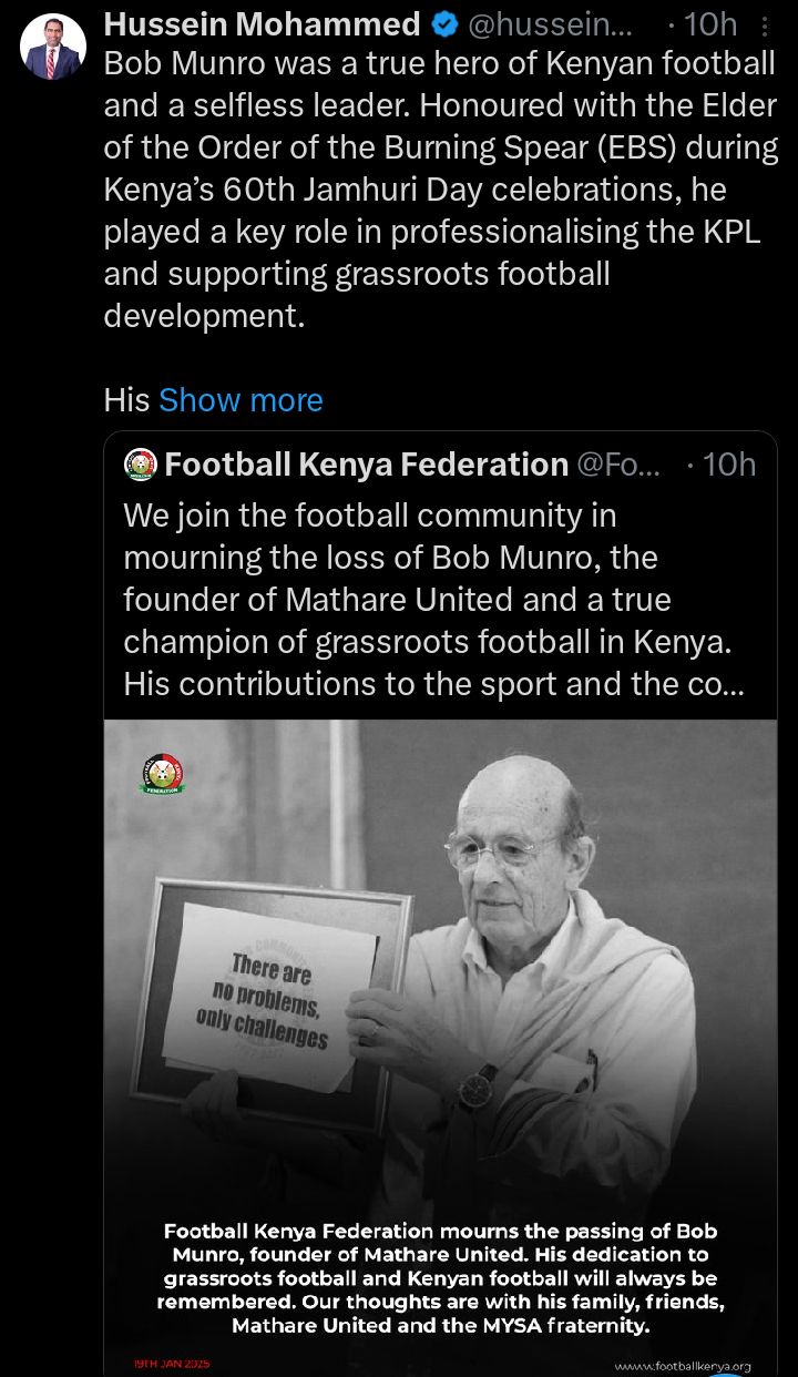Football Kenya Federation (FKF) President Hussein Mohammed described Munro as a hero whose legacy will endure for generations. “Bob Munro was a selfless leader who dedicated his life to the growth of the game.
