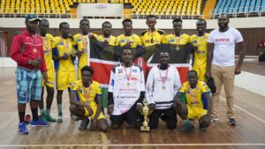 Kenya’s men floorball team in a photo session while celebrating the championship at the Kasarani indoor arena|photo courtesy| B.Marshall|