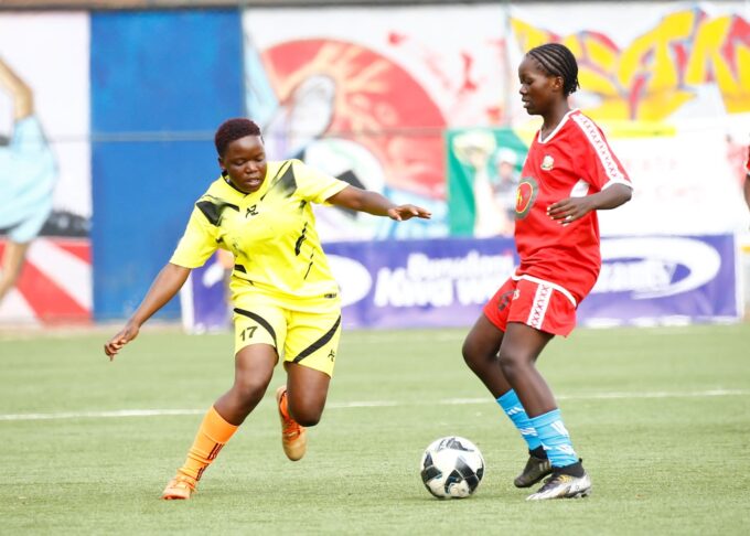 Kisumu All Starlets player (in red) during their man against Kisped Queens in Kisumu today. PHOTO by Tackless. Vihiga Queens gave Wadadia FC...