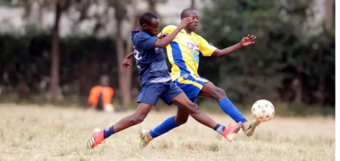 Highway Secondary School’s Louis Otieno (right) dribbles past Waylight High School’s Iranzi Bonk during the Nairobi Region Secondary Schools Term Two B Games...