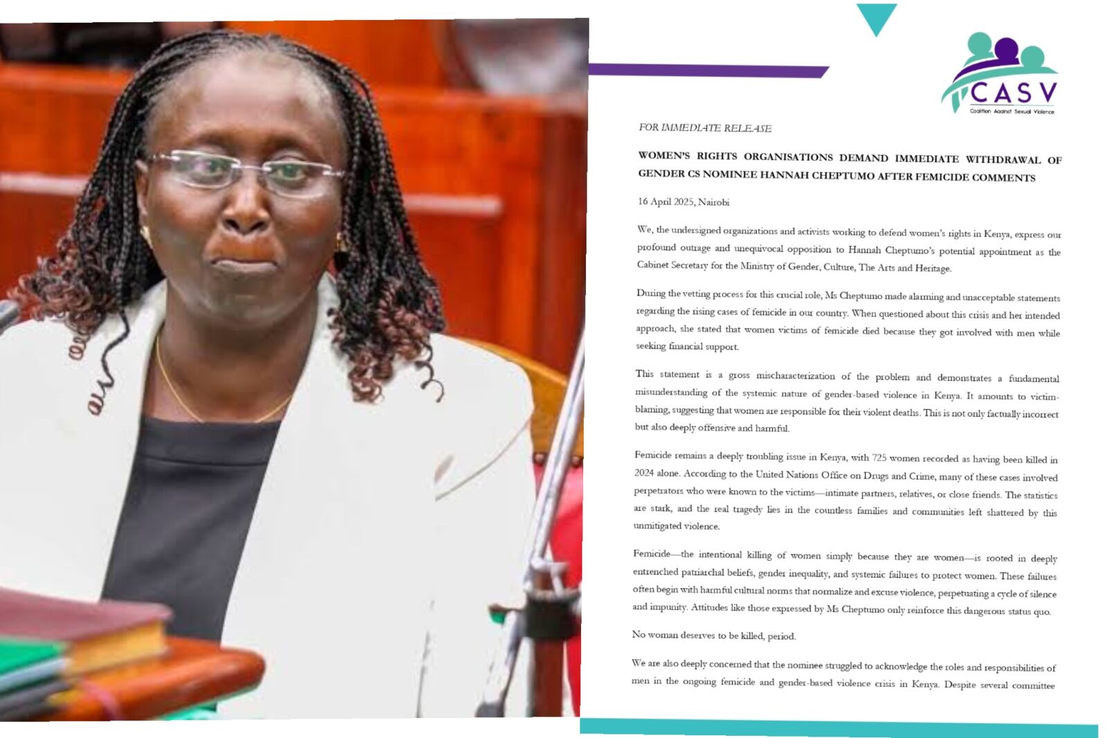 Coalition Against Sexual Violence together with a group of rights activists in fight for women rights has released a 4-point demand to the government on Cheptumo’s nomination.